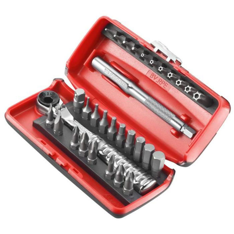 - 31 piece set with compact ratchet for bits