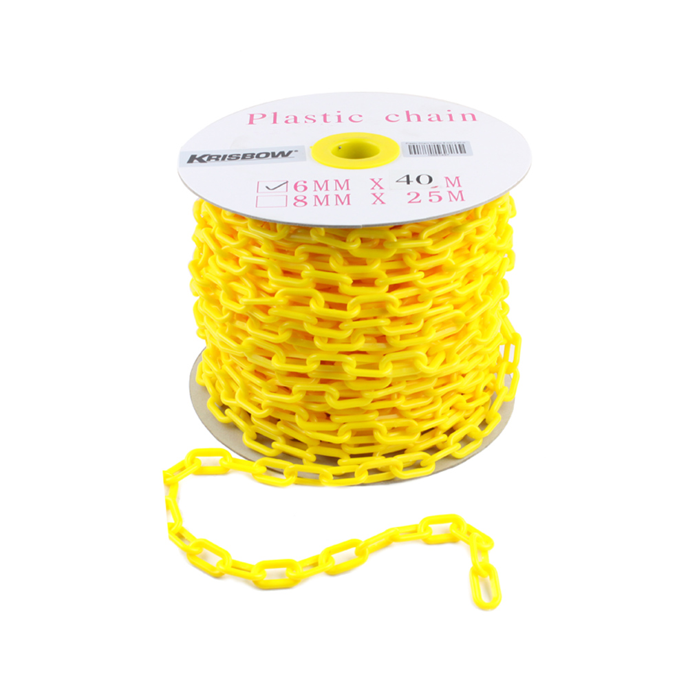 Plastic chain is available in diameter of 6 mm, including multicolor combinations, reflective, gold-tone, and chrome-tone. While not loa d-bearing, these plastic chains are durable and attractive. |