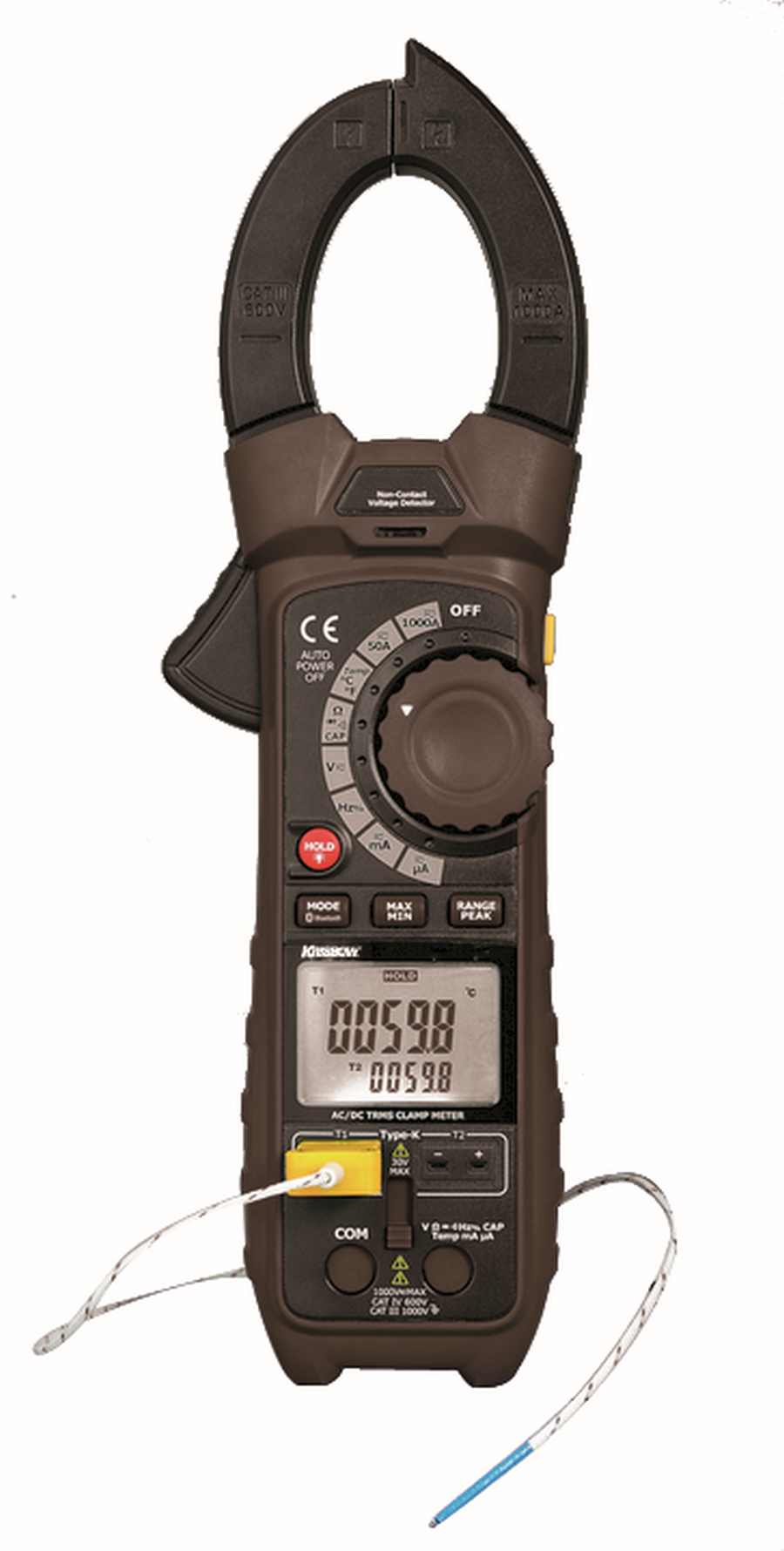 10106733 The True RMS Clamp Meter measures AC/DC voltage and current, re sistance, continuity, capacitance, frequency and duty cycle. Special fea tures include Thermocouple Temperature and Non Contact Voltage Detector. The double molded case is designed for |