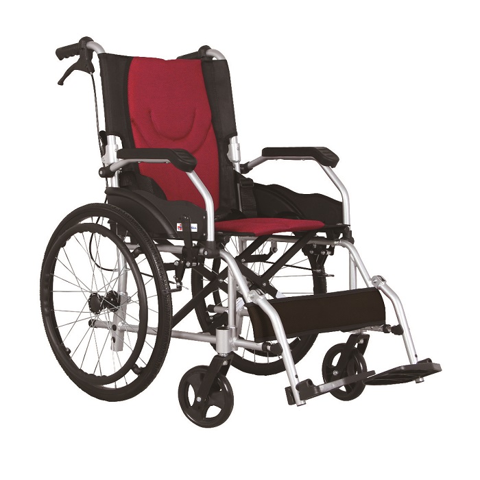 Dengan bahan aluminium dan sandaran punggung yang dapat dilipat; sandaran tangan juga dapat dilepas, berbahan nilon di kedua sisi kursi; terdapat pijakan kaki yang nyaman dan memiliki rem pada rodanya |