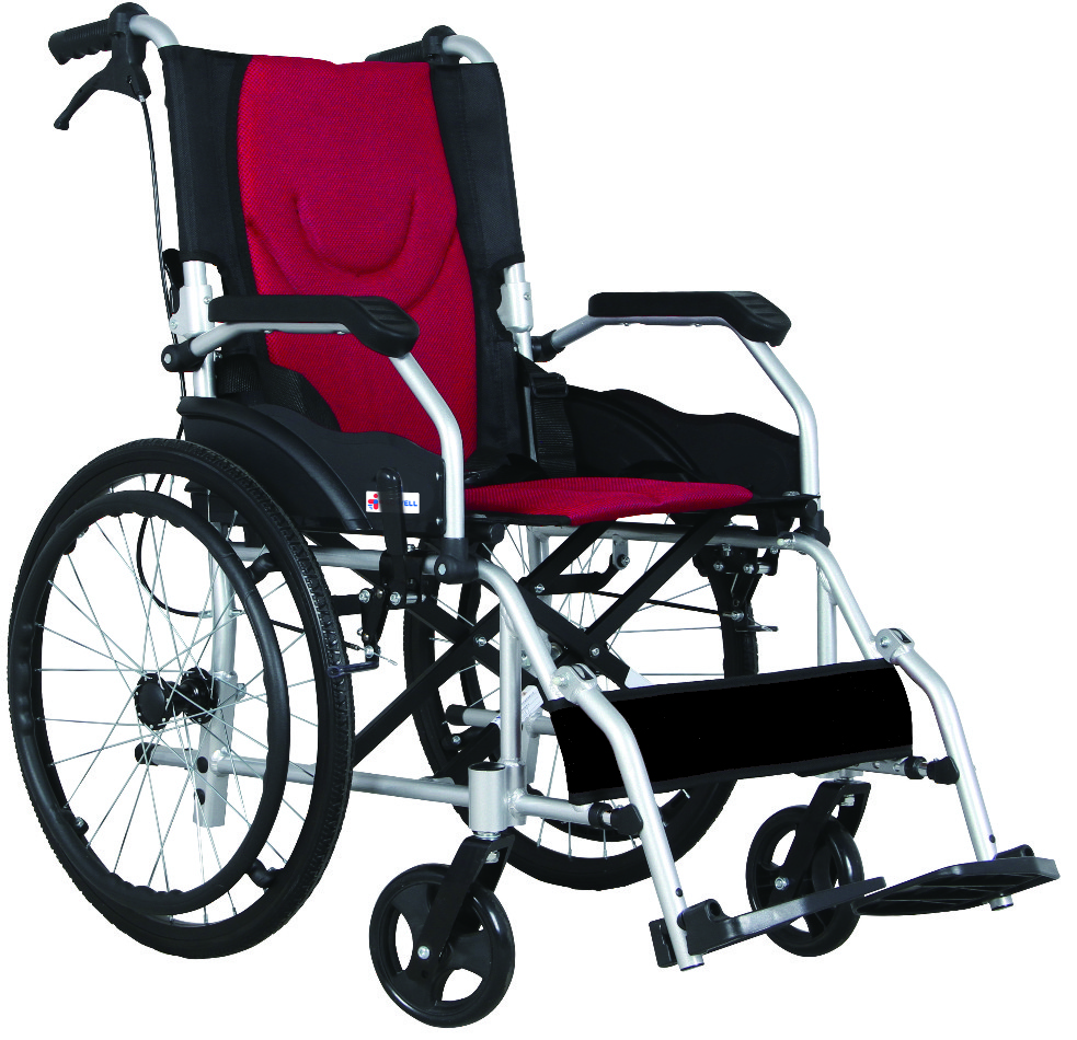 Foldable BACKREST aluminum frame; detachable PU armrest;mesh in the middle (2 layer),nylon on both sides seat; Elevating footrest; black plastic footplate; united brake
