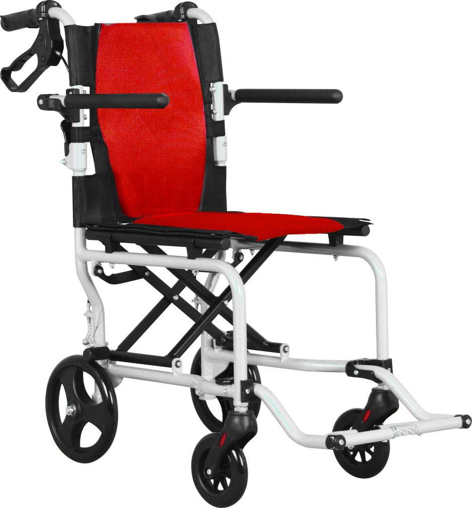 kursi roda travel dengan bahan Aluminum frame. Ini sangat ideal untuk penggunaan sesekali baik di dalam maupun di luar ruangan di mana medannya seperti Kawasan perbelanjaan, bandara dll. Sangat ringan mudah diangkut dan dilengkapi dengan tas