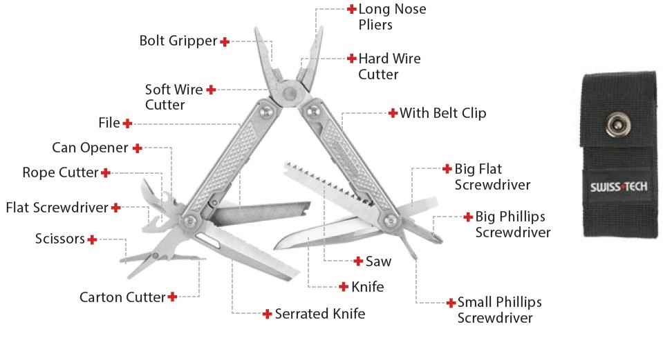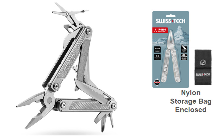- The Swiss+tech 17-in-1 multitool, features a stainless steel handle and an ultra-sharp 8CR13 stainless steel knife with a hardness up to HRC 56-60.