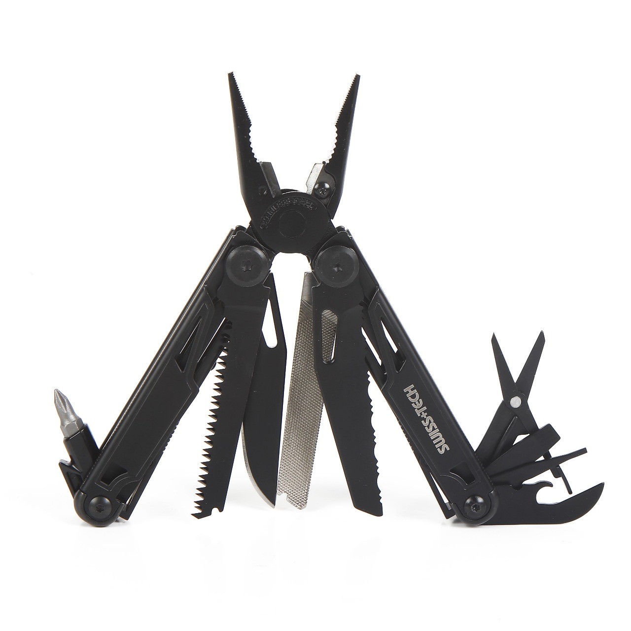 - Included components : Key, bottle opener, wrench, screwdriver, wrench, ruler, can opener, saw, can opener, carabiner, awl, flashlight, pen, pliers, scissors, scissor.